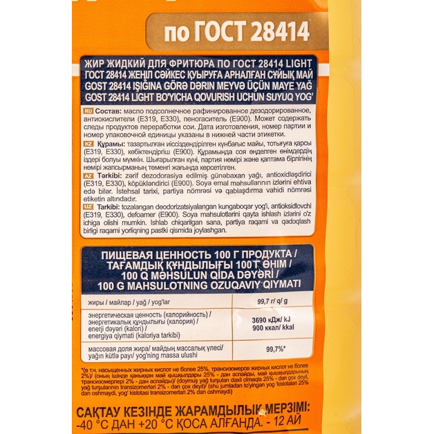 Универсальный продукт для обжарки самых разнообразных продуктов во фритюре и на сковороде: овощей, картофеля-фри, мясных, куриных, рыбных блюд, пончиков, пирожков, беляшей и других изделий из теста, а также для применения в производстве чипсов, снеков, макаронных изделий быстрого приготовления. Продукты и полуфабрикаты можно обжаривать как в свежем, так и в замороженном виде, в панировке, в кляре. Не содержит пальмового масла.